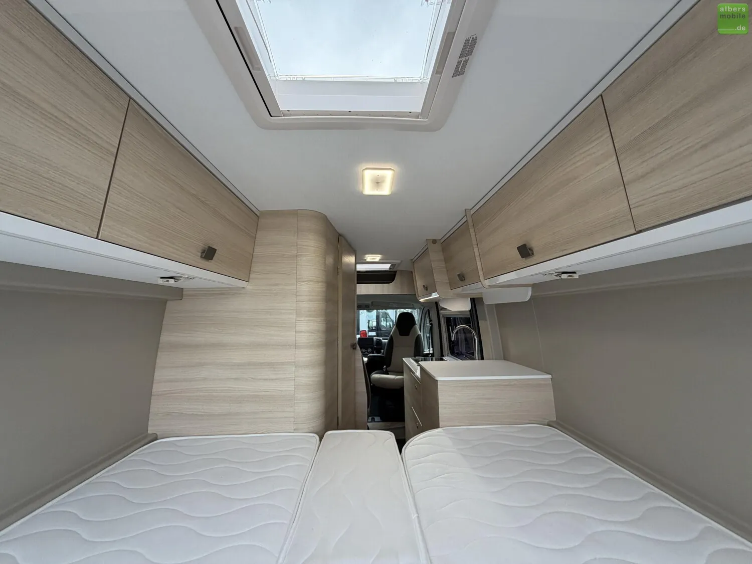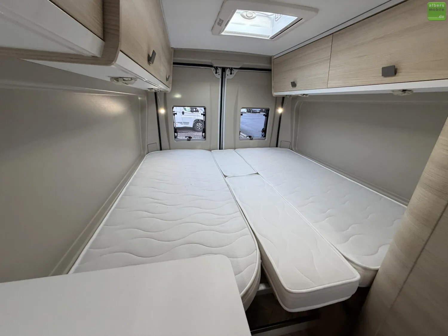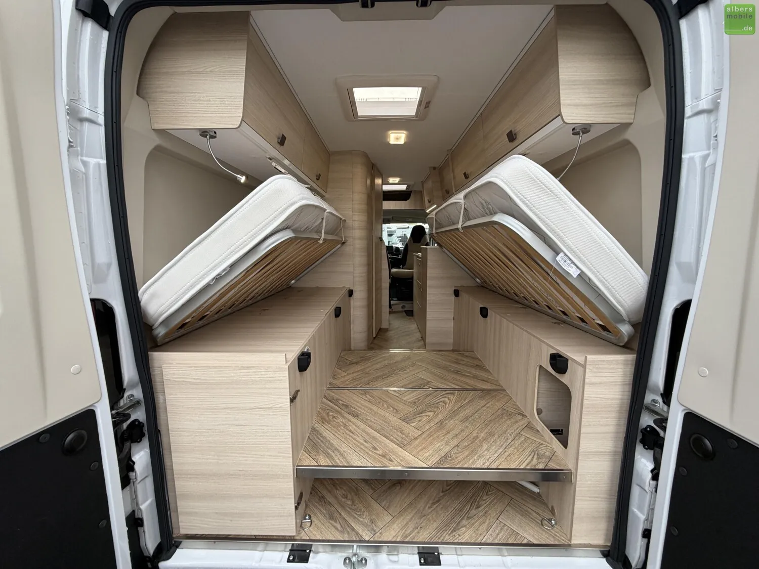Mit dem V 217 haben Sie 2 große Einzelbetten in einem Van mit nur 6,36 m. Die praktischen Ablagen sowie der Doppelboden unter dem Bett zum Verstauen von Tisch und Stühlen werden Ihnen gefallen. Ideal für ein Paar, das ganz unauffällig überallhin reisen möchte.