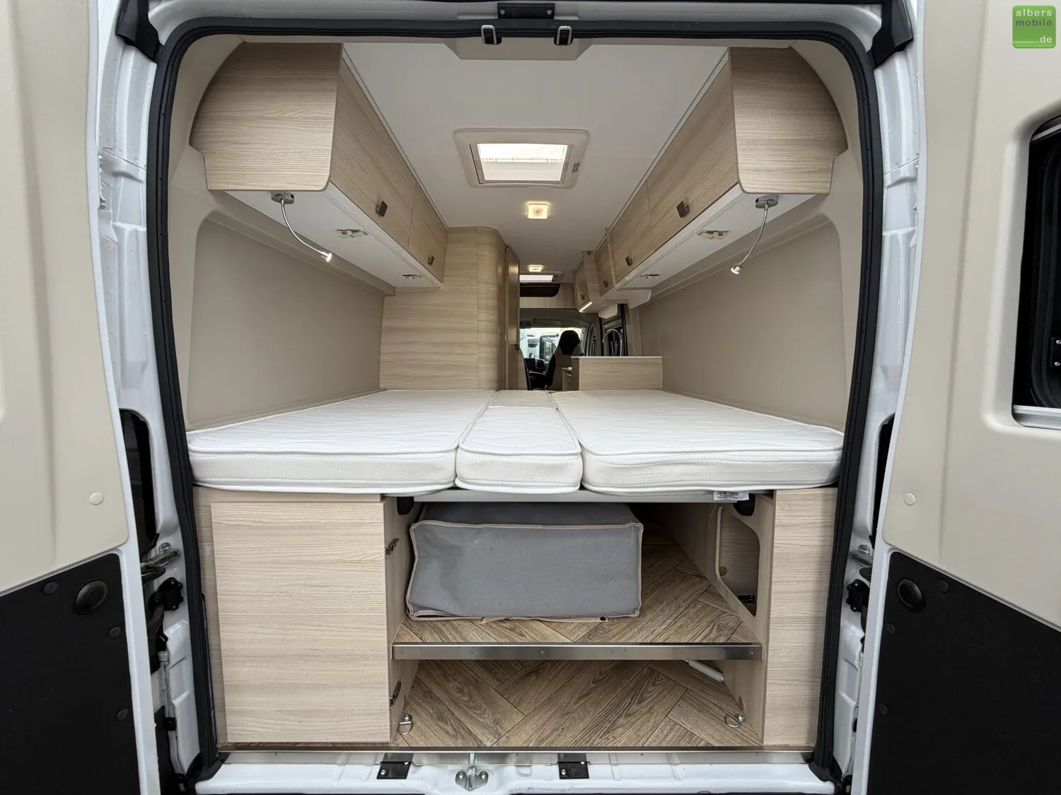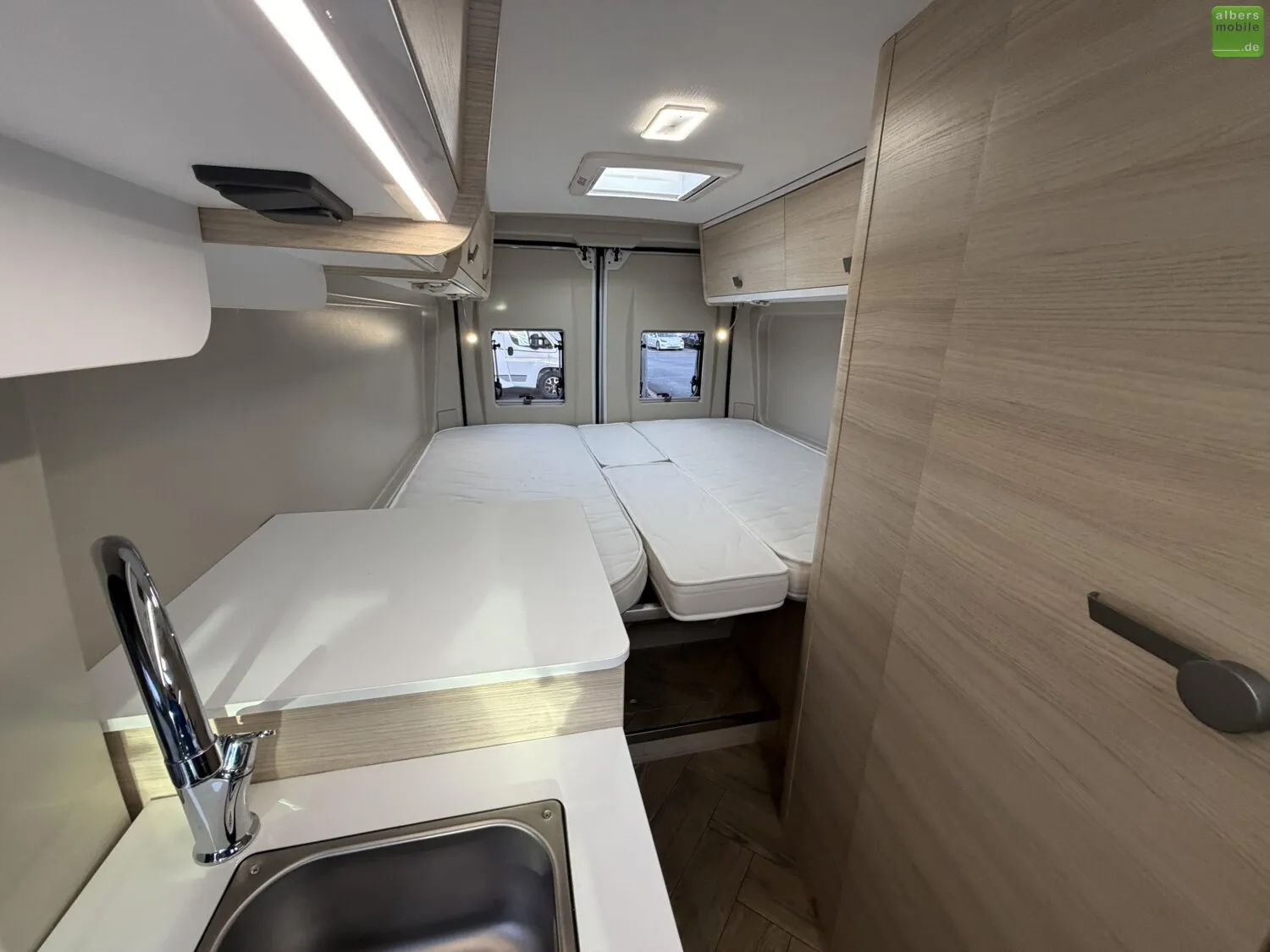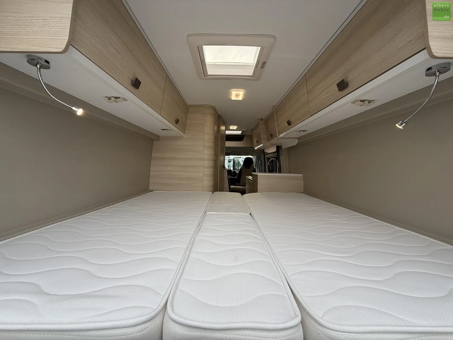 Mit dem V 217 haben Sie 2 große Einzelbetten in einem Van mit nur 6,36 m. Die praktischen Ablagen sowie der Doppelboden unter dem Bett zum Verstauen von Tisch und Stühlen werden Ihnen gefallen. Ideal für ein Paar, das ganz unauffällig überallhin reisen möchte.