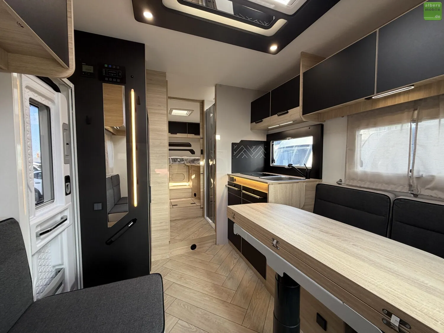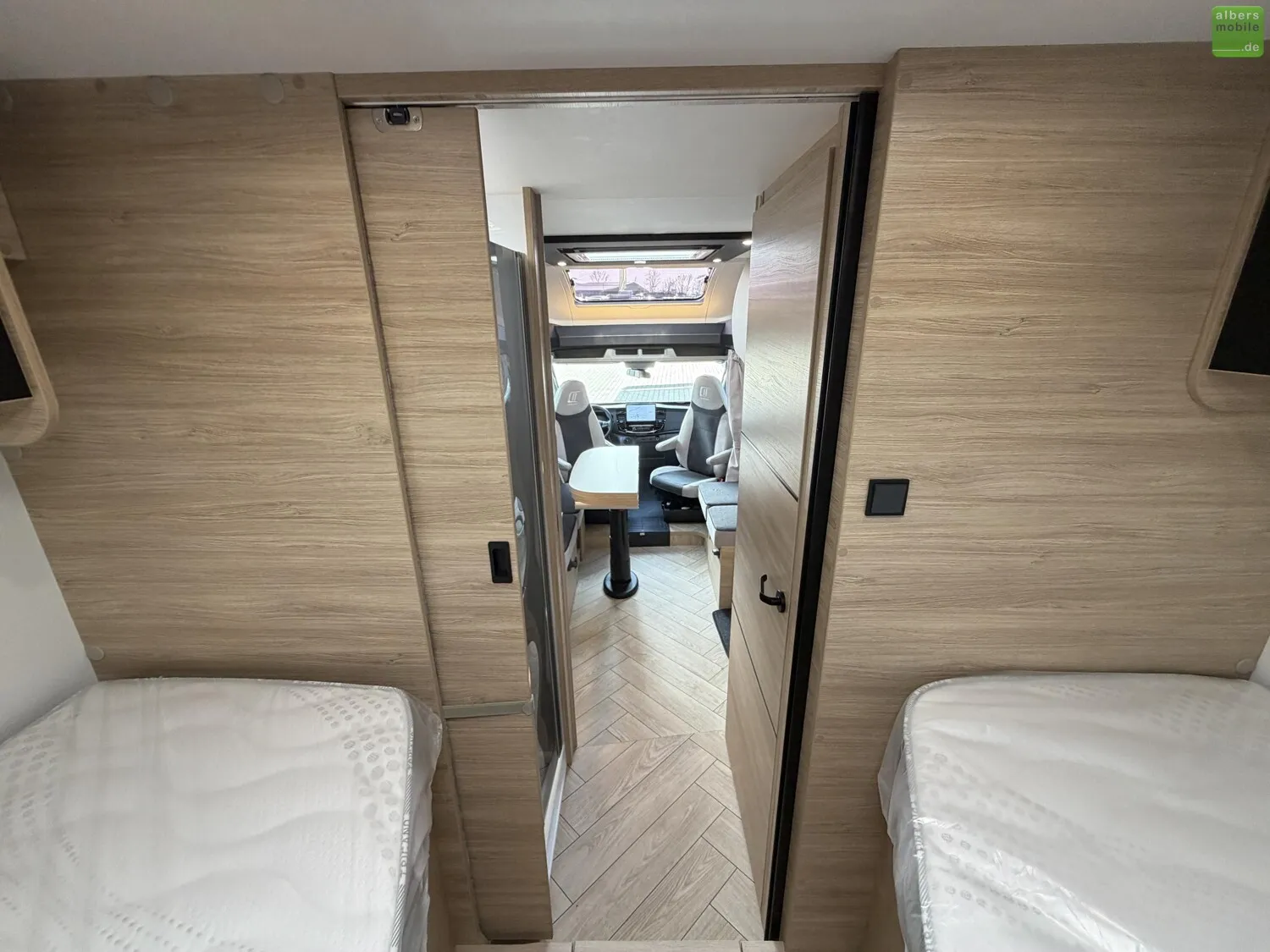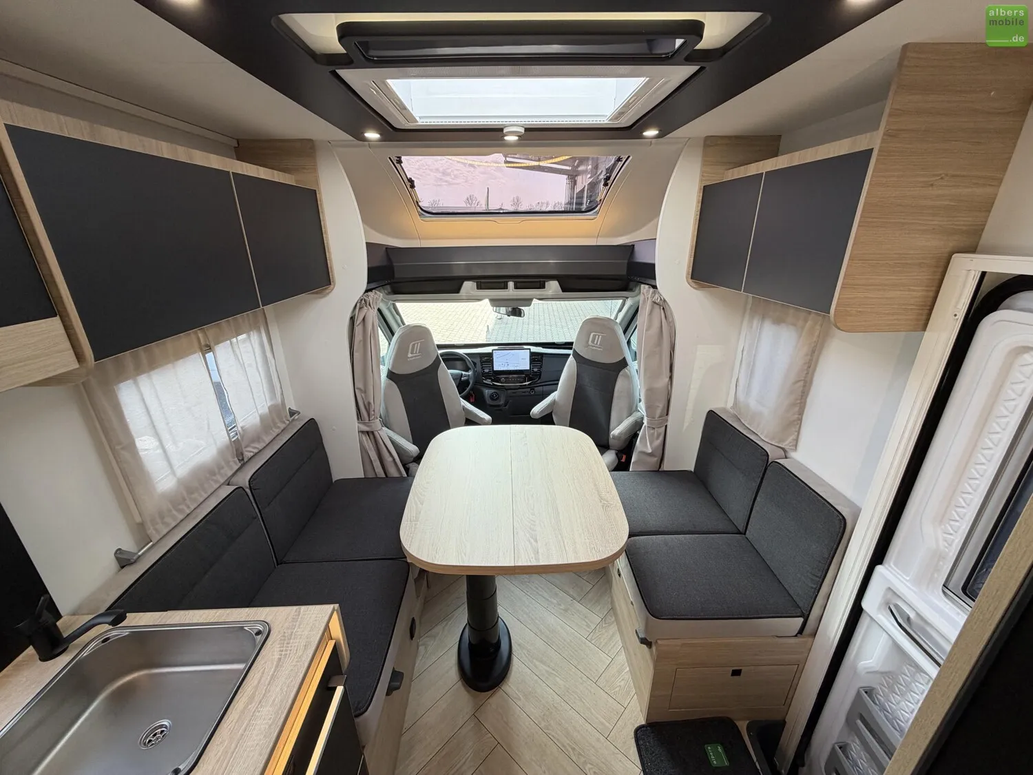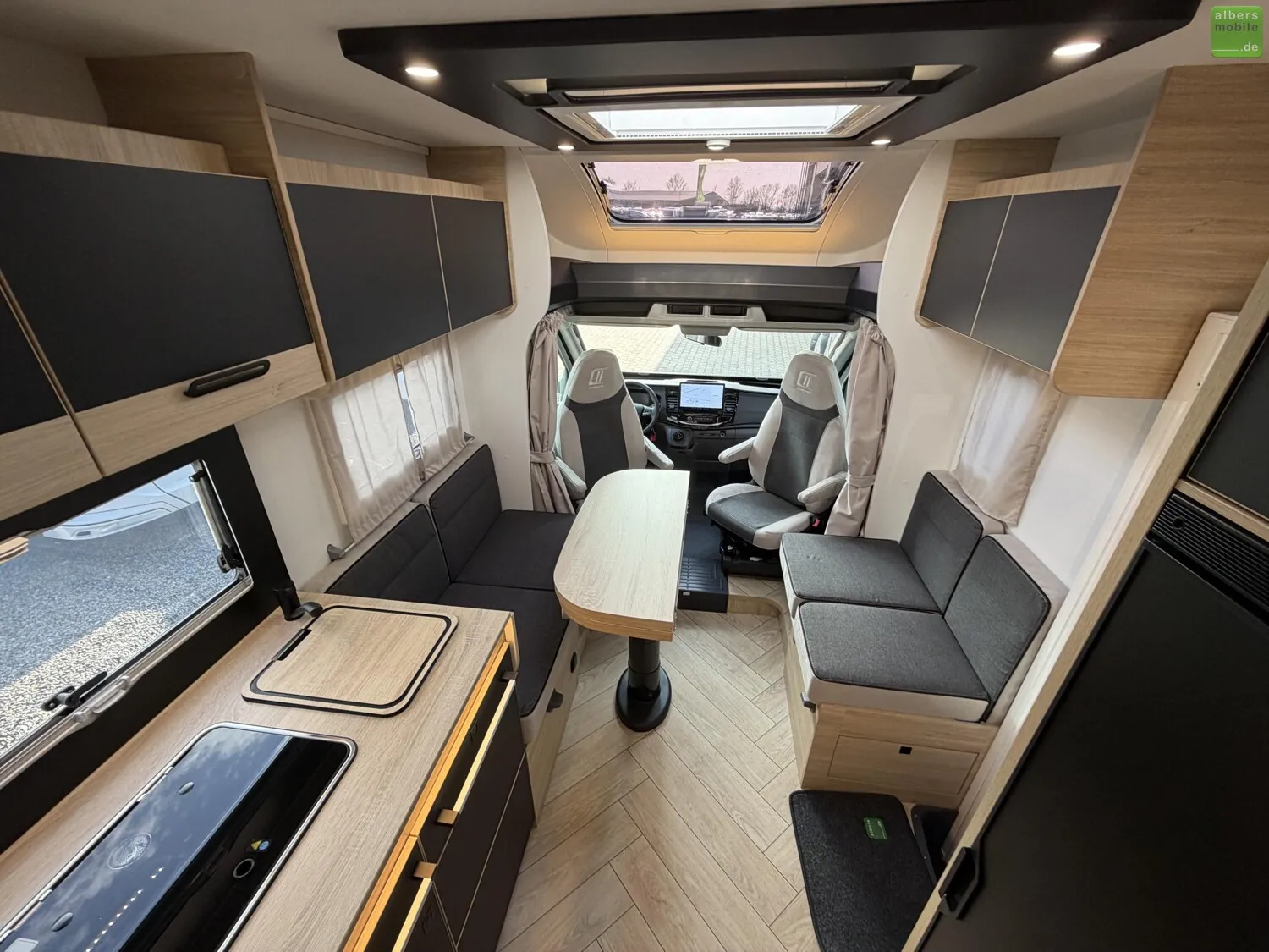 Der Teilintegrierte 317 vereint Raum, Komfort und Stil mit zwei 90?cm breiten Einzelbetten, die sich zu einem Kingsize-Bett verbinden lassen, und einer großzügigen Face-to-Face-Sitzgruppe - ideal zum Entspannen oder gemeinsamen Essen. Das doppelt abgetrennte Bad trennt Wohn- und Schlafbereich vollständig und sorgt so für mehr Privatsphäre und Komfort. Ein Modell für anspruchsvolle Reisende, die Wert auf Bewegungsfreiheit und ein stilvolles Interieur legen.