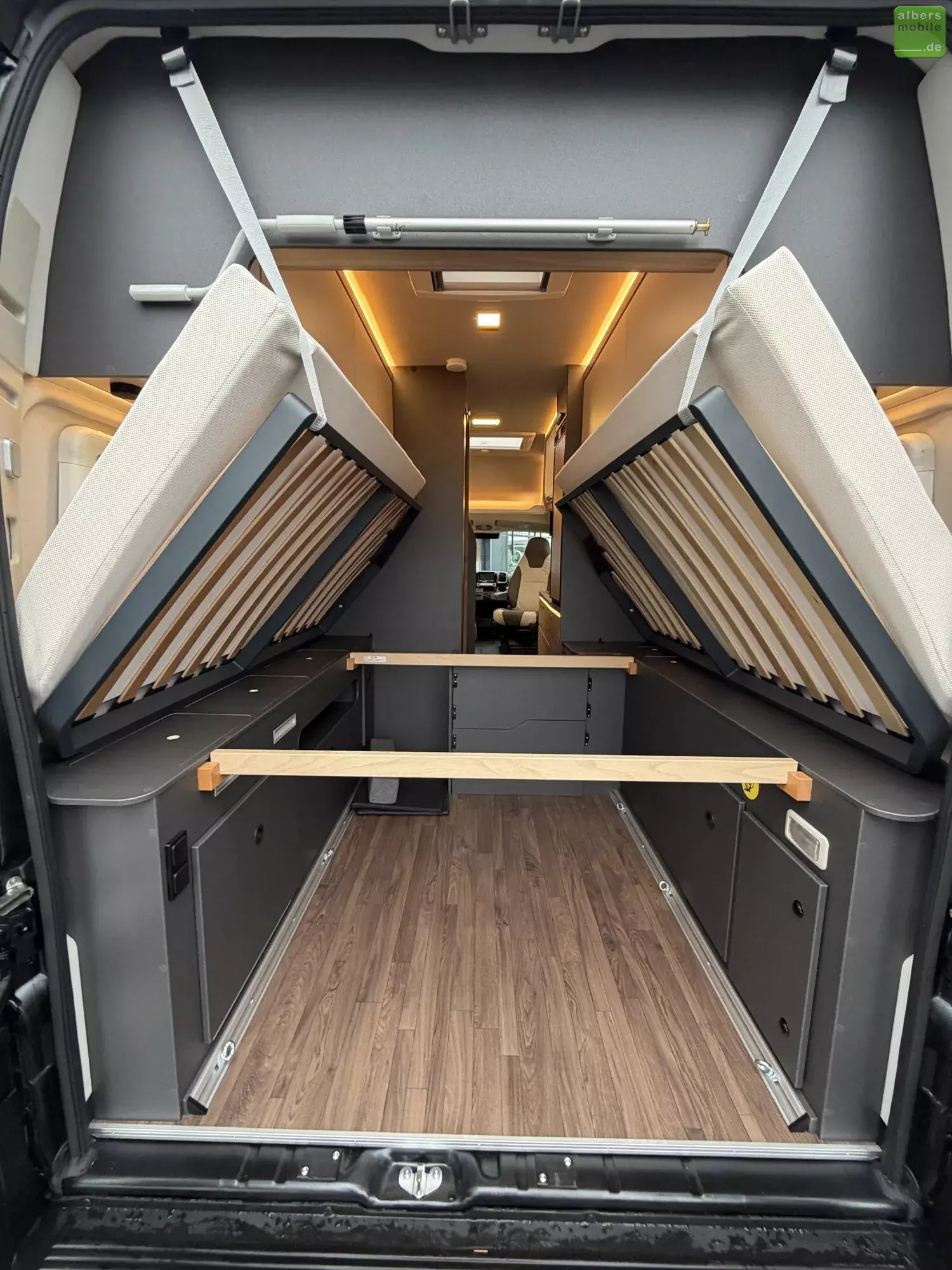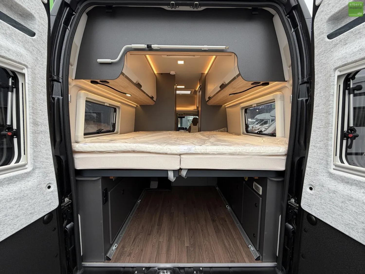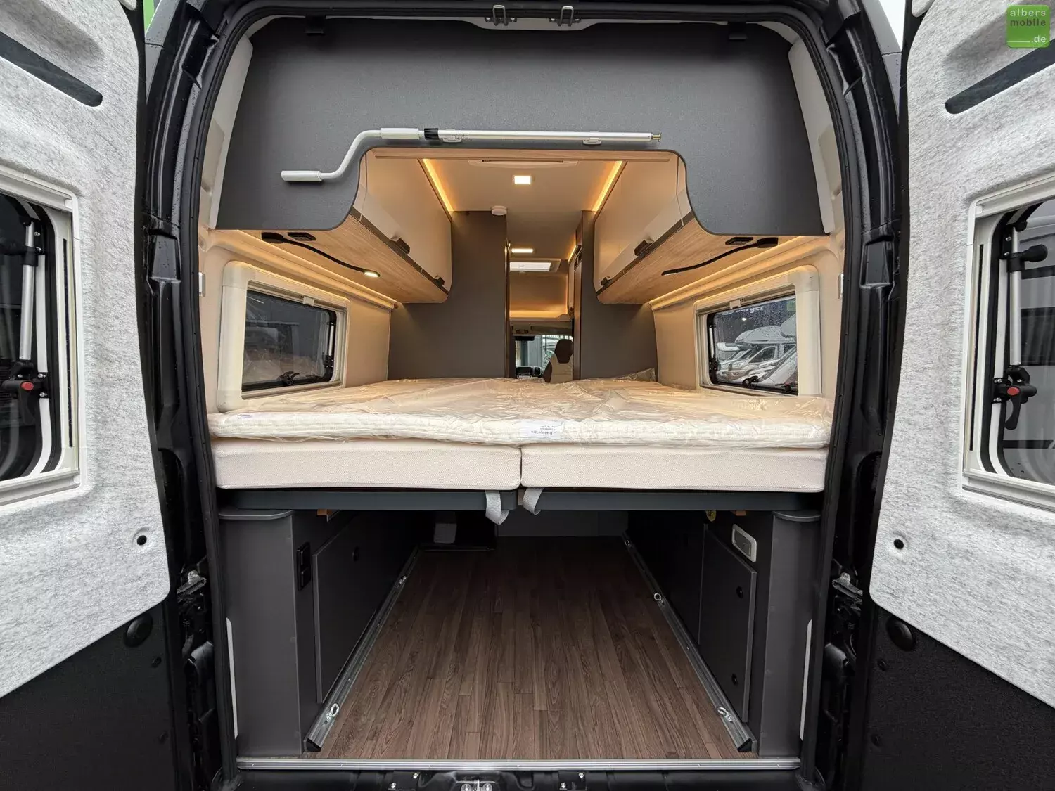 - Vorgehängte Ausstellfenster an beiden Hecktüren inkl. Insektenschutz und Verdunklung