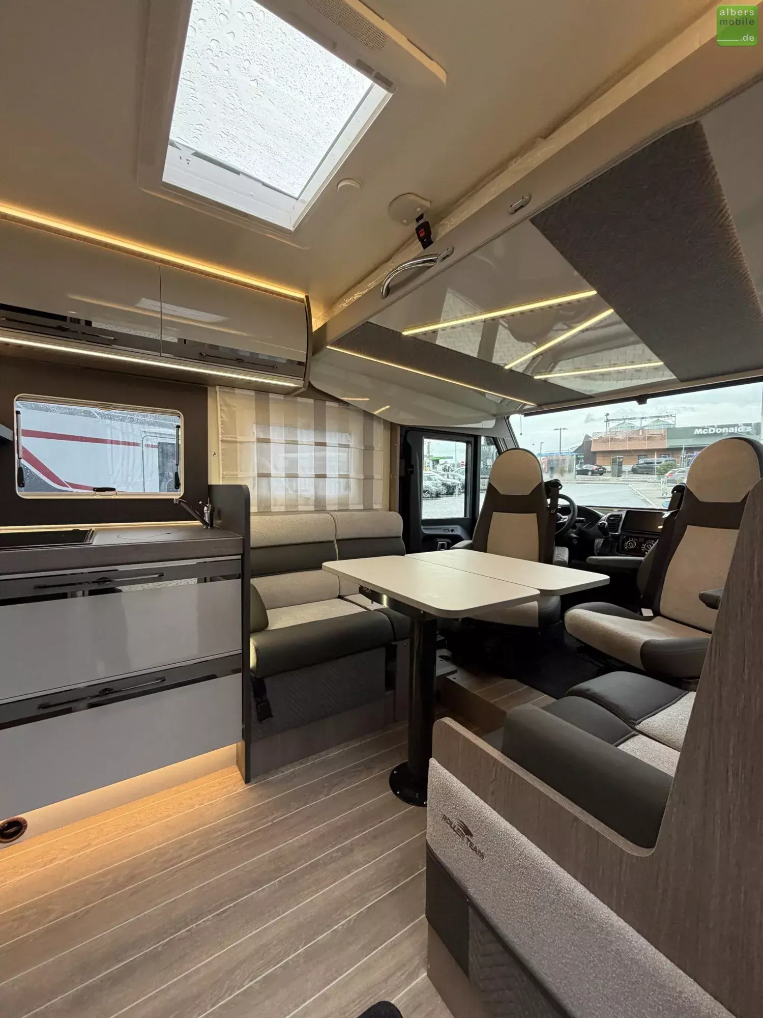 - Drehbarer Fahrer- und Beifahrersitz mit Lordosenstütze und Armlehne (Captain chairs)
