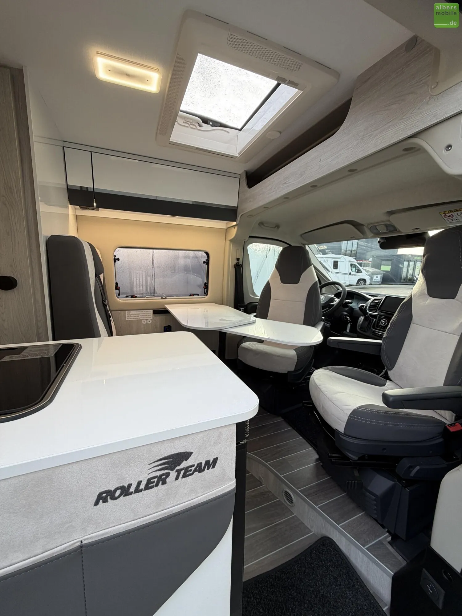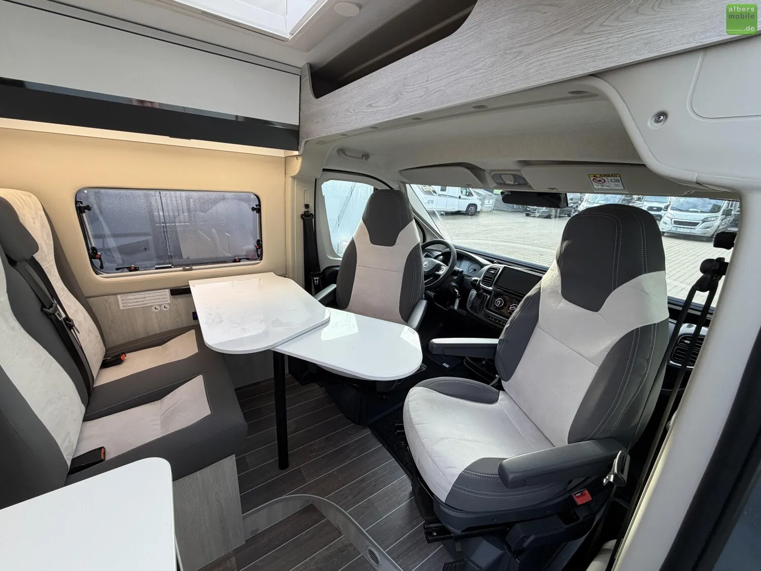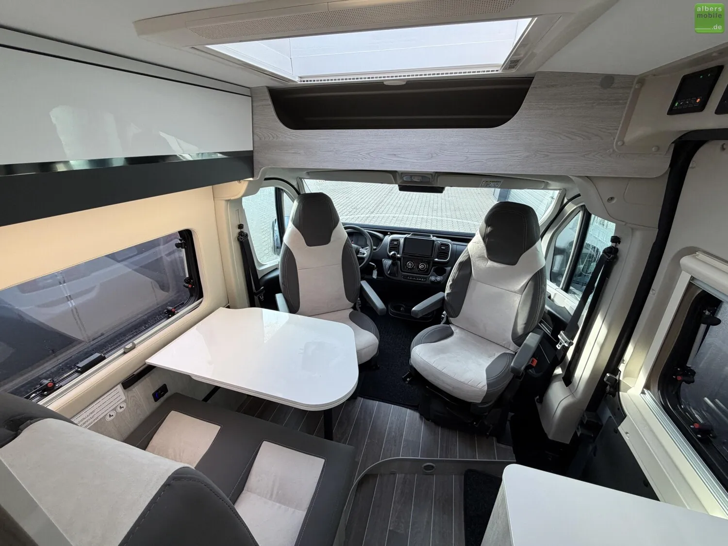 - Drehbarer Fahrer- und Beifahrersitz mit Lordosenstütze und Armlehne (Captain chairs)