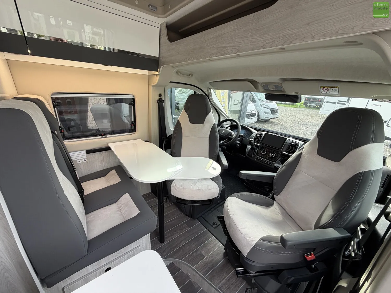 - Drehbarer Fahrer- und Beifahrersitz mit Lordosenstütze und Armlehne (Captain chairs)
