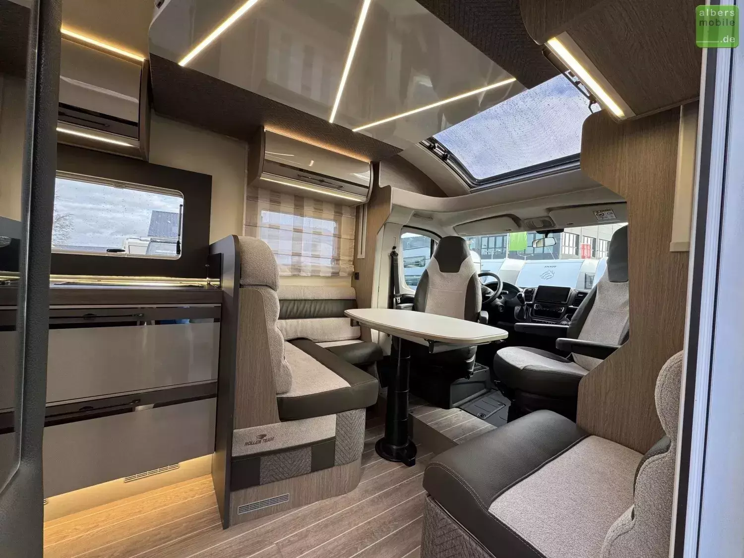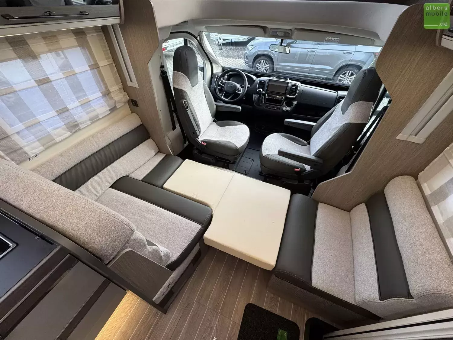 - Drehbarer Fahrer- und Beifahrersitz mit Lordosenstütze und Armlehne (Captain chairs)